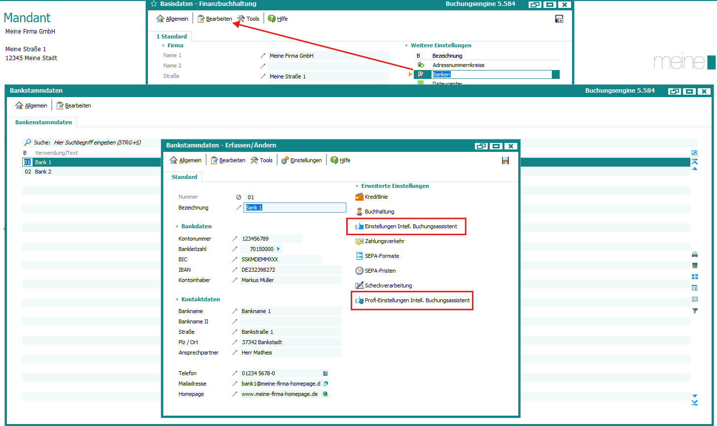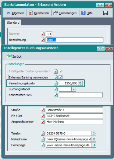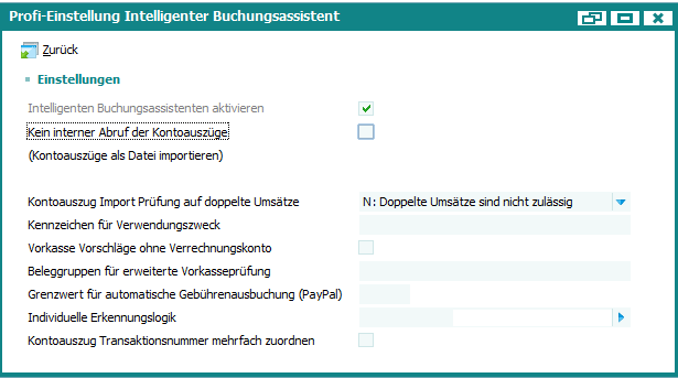 Fibu Basisdaten > Weitere Einstellungen > Bankenstammdaten > Bearbeiten > Intelligenter BuchungsassistentÂ