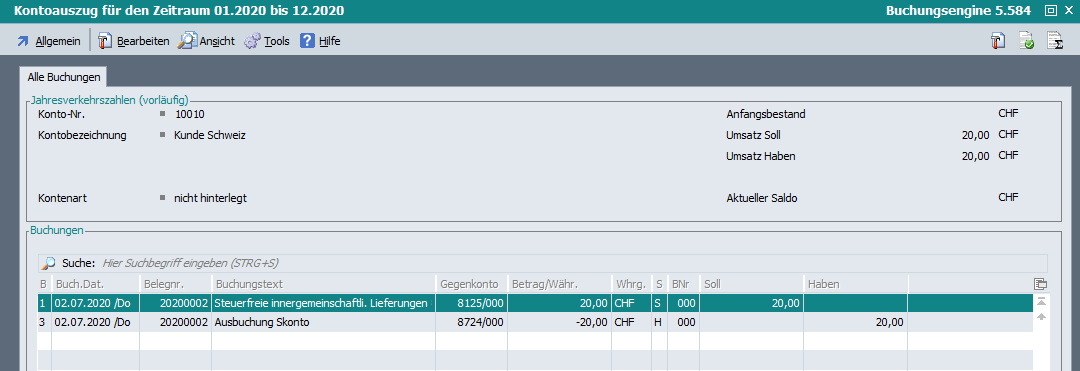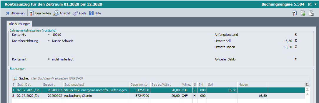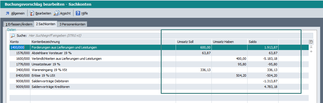 Sofern man im Dialog „Buchungsvorschlag bearbeiten“ unter Einstellungen „Karteikarte für Sach- und Personenkonten anzeigen“ aktiviert hat, wurden die Werte in den Spalten „Umsatz Soll“, „Umsatz Haben“ und der „Saldo“ auf beiden Karteikarten nicht angezeigt.