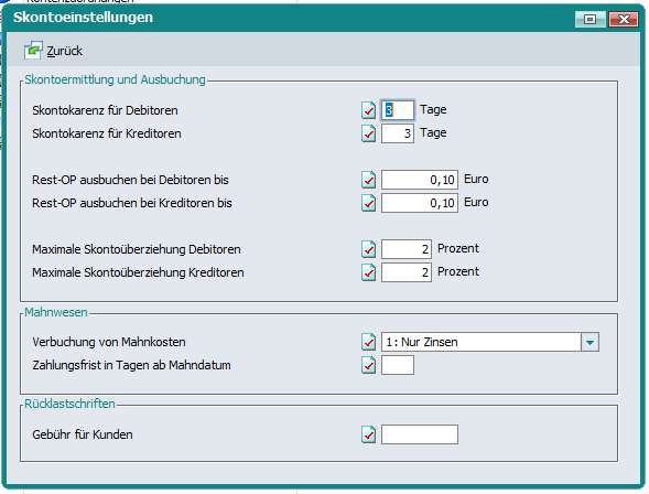 Fibu Basisdaten > Bearbeiten > Skonto- /Mahneinstellungen