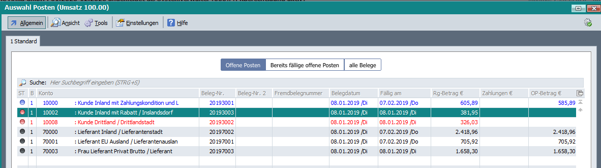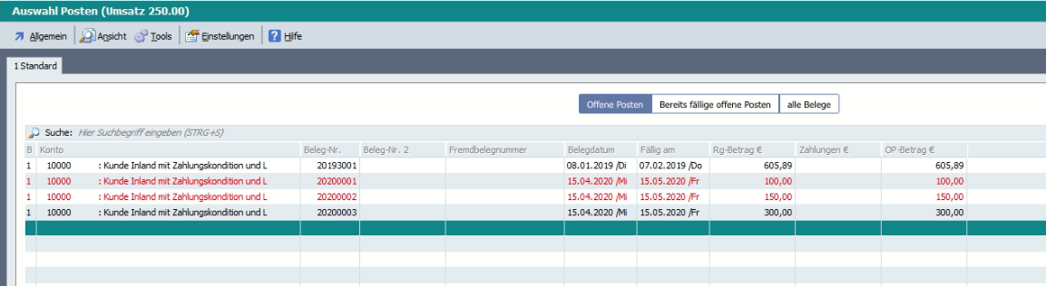 Die Ergebnisse werden in der Tabelle „Auswahl Posten“ angezeigt und können für den Buchungsvorschlag direkt übernommen werden.