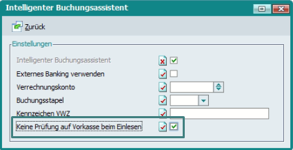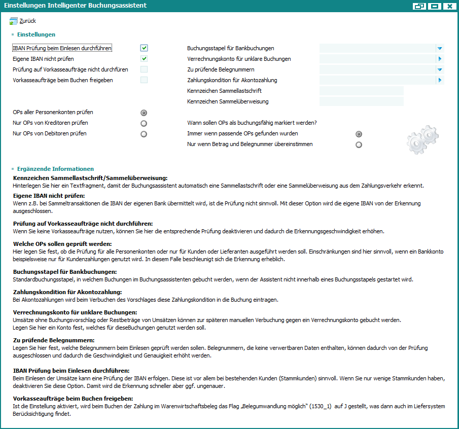 Im Intelligenten Buchungsassistenten gibt in den Basisdaten, Bankenstamm, Adressstamm, Zugriffsrechten und direkt im Intelligenten Buchungsassistenten Einstellmöglichkeiten.