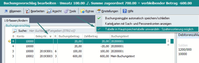 Es wird dann auf der ersten Karteikarte des Intelligenten Buchungsassistenten eine Hauptspeichertabelle verwendet. Die zweite Karteikarte ist weiterhin eine Index Tabelle.