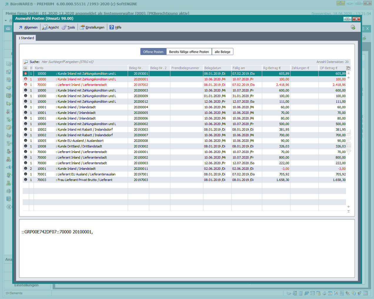 Ab Revision 50758/BETA wird beim Erfassen eines OP-Ausgleichs in der Tabelle „Auswahl Posten“ und beim Erfassen einer Vorkassenzahlung in der Tabelle „Auswahl Vorkasse Aufträge“ der Verwendungstext in einem eigenen Rahmen angezeigt.