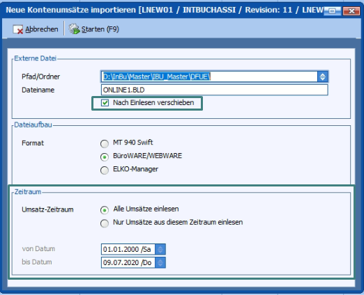 Zusätzlich kann noch entschieden werden, ob ALLE Umsätze aus der Datei eingelesen werden sollen oder nur ein bestimmter Zeitraum.