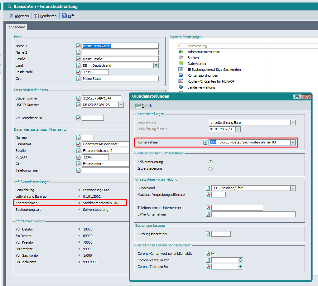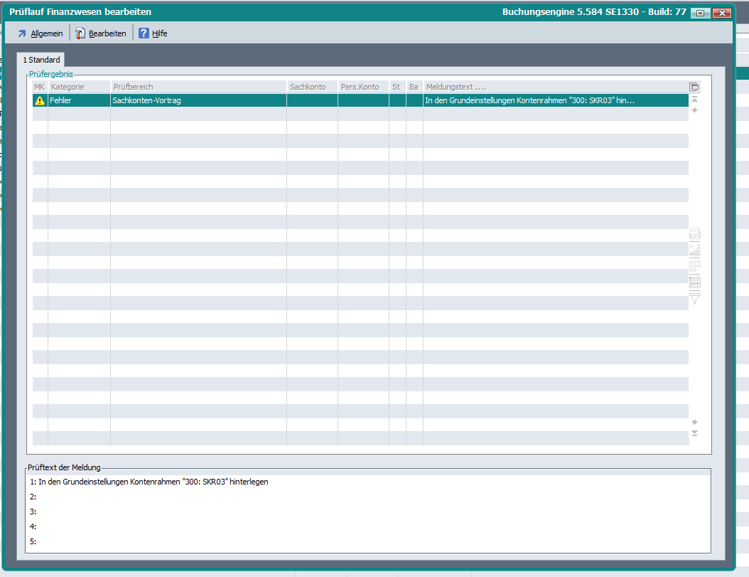 Ab Revision 56484 wird im Zuge des Prüflaufs Finanzwesen Bereich Finanzbuchhaltung geprüft, ob in den Basisdaten Finanzbuchhaltung -> Bearbeiten -> Grundeinstellungen im Feld „Kontenrahmen“