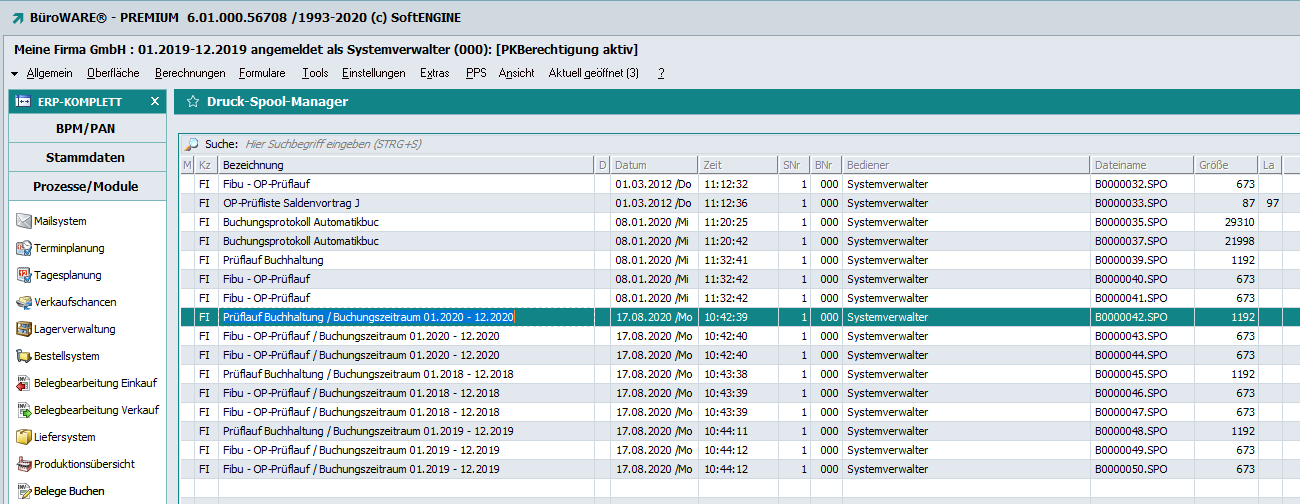 Ab Rev. 56708 Beta und Rev. 56736 Patch wird beim Spooldruck von „Prüflauf Buchhaltung“ und „OP Prüflauf“ der Buchungszeitraum in die Bezeichnung übernommen.