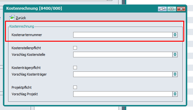 in die Finanzbuchhaltung übernommen werden, muss grundsätzlich im zu bebuchenden Sachkonto unter Bearbeiten -> Kostenrechnung eine Kostenartennummer eingetragen sein.