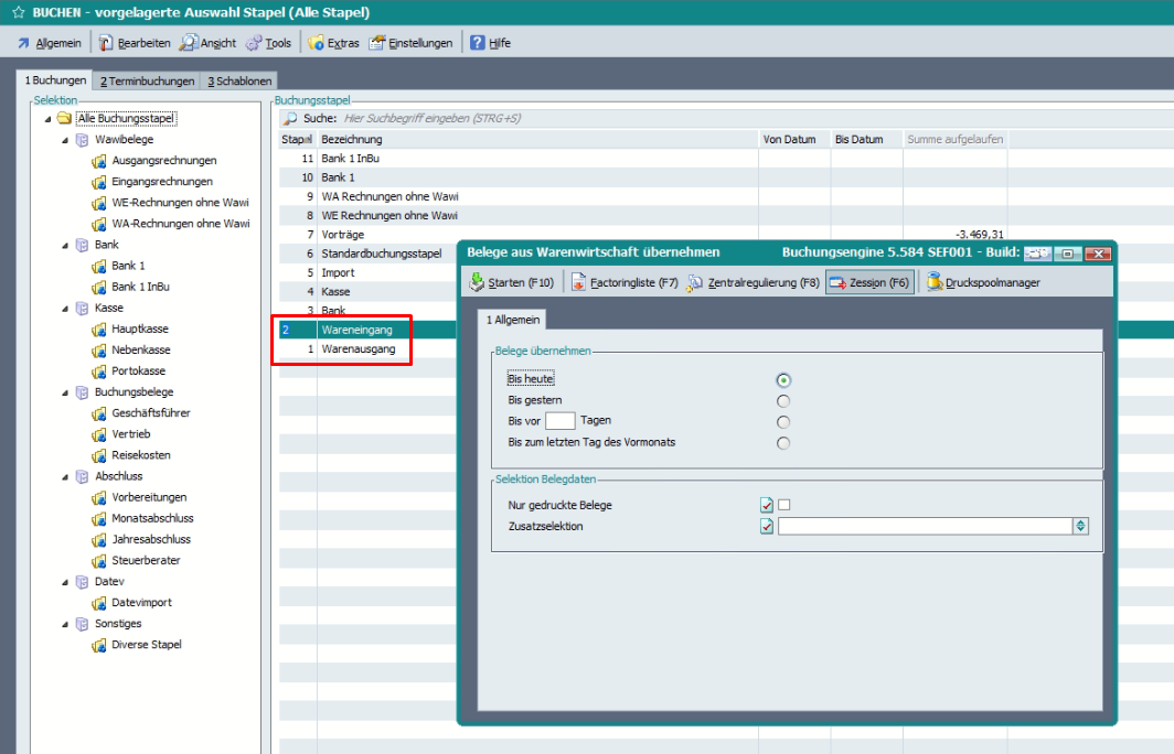 In Revision 58508/BETA wurde beim Aufruf des Wawi Fibu Übernahme Dialoges für Wareneingangs- und Warenausgangsbelege über den Buchungsstapel (Buchungsverarbeitung 402 und 401) ein falscher Dialog aufgerufen.
