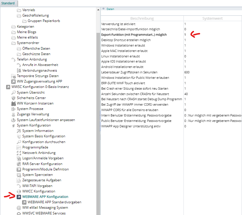 3a) System Konfiguration -> WEBWARE APP Konfiguration -> Export-Funktion (mit Programmstart…) möglich -> Aktivieren: