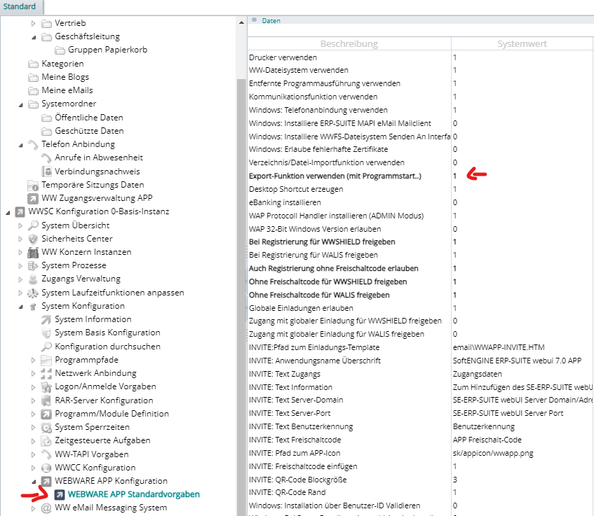 3b) System Konfiguration -> WEBWARE APP Konfiguration -> WEBWARE APP Standardvorgaben -> Export-Funktion (mit Programmstart…) möglich -> Aktivieren: