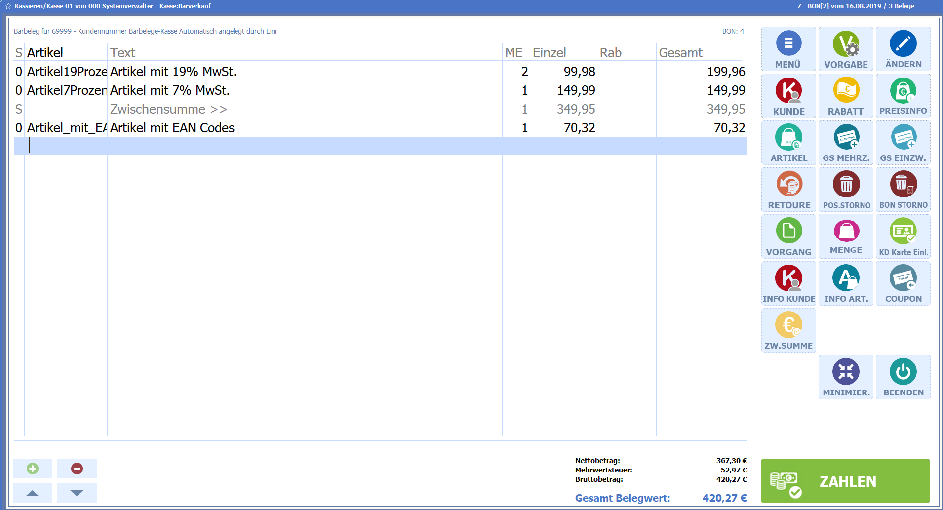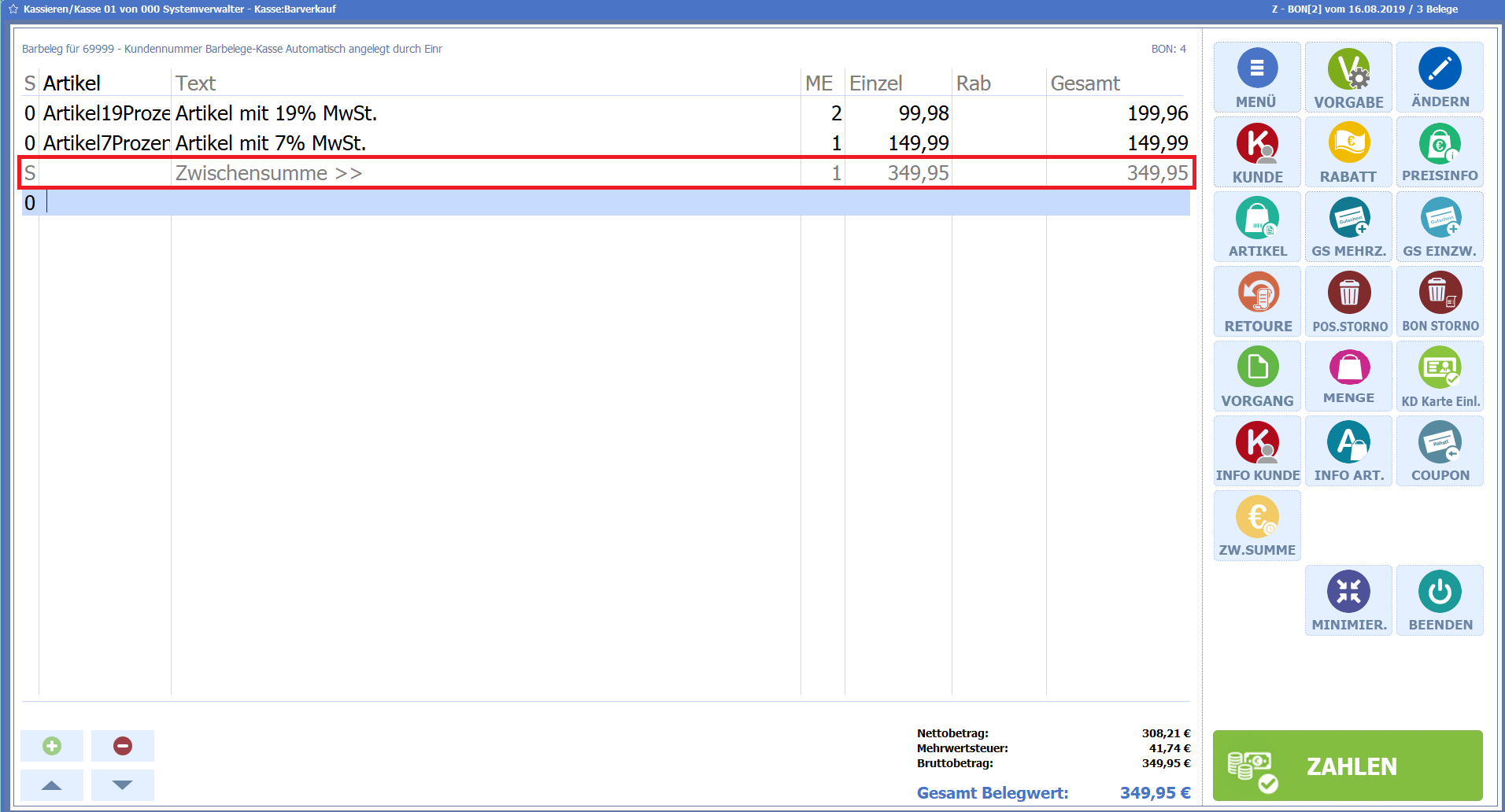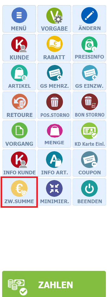 Mit dieser Programmänderung gibt es eine neue Funktion, um während des Kassiervorganges eine Zwischensumme zu bilden.