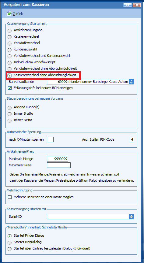 Hierzu gibt es unter „Vorgaben zum Kassieren“ in den Kassenbasisdaten das Flag „Kassiererwechsel ohne Abbruchmöglichkeit“.