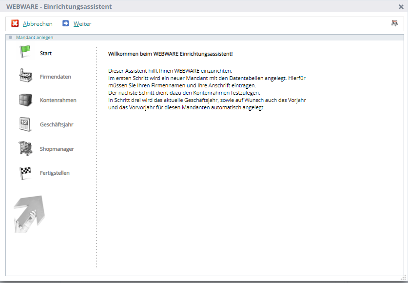 Das Anlegen eines neuen Mandanten in WEBWARE war nicht möglich, da der Dialog noch nicht webalyzed war. Es war nicht möglich die einzelnen Schritte im Assistenten auszuführen und musste bei Bedarf über BüroWARE (wwwin32.exe) angelegt werden.
