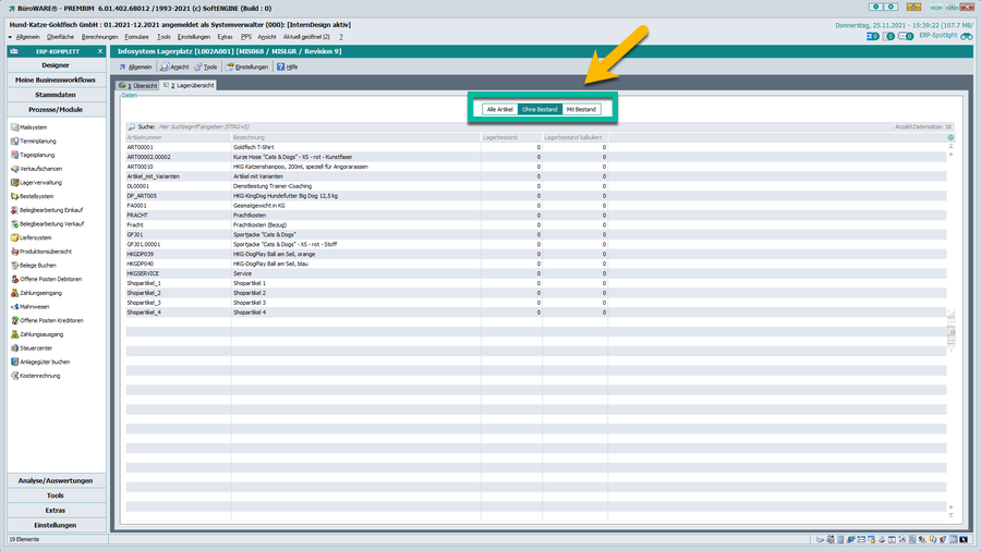 Auf der Karteikarte 1 des Infosystems „Lagerplatz“ wird nun ein weiterer Spoiler angezeigt, der nun zwischen allen Artikel und den Artikeln, die sich momentan auf diesem Lagerplatz befinden, unterscheidet.