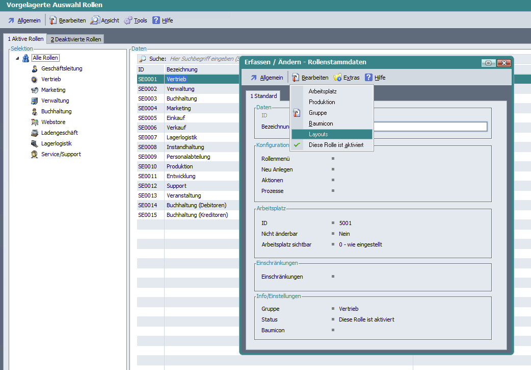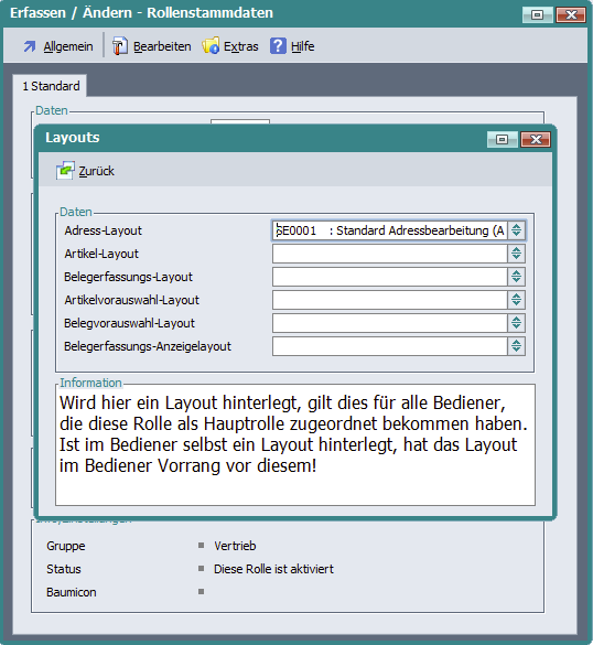 Rollenstammdaten: Neue Felder für Layoutzuordnungen |