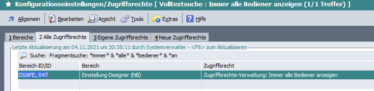 [DSAFE, Nr: 047 - Einstellung Designer (NB), Zugriffsrechte-Verwaltung: Immer alle Bediener anzeigen]