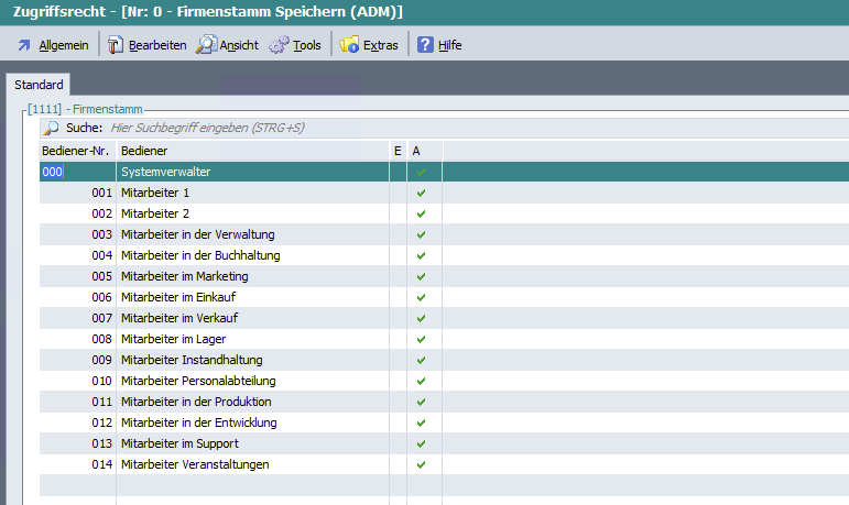 Ist dieses aktiv, wird in der Zugriffsrechte-Verwaltung die Speicherselektion ignoriert und immer alle Bedienerspalten/Zeilen angezeigt.