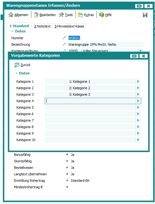 Im Warengruppenstamm gibt es neue Felder, um Vorgabewerte für Artikelkategorien bereits in der Warengruppe vorbelegen zu können. Diese Felder finden Sie in der neuen Optionsmaske „Vorgabewerte Kategorien“.