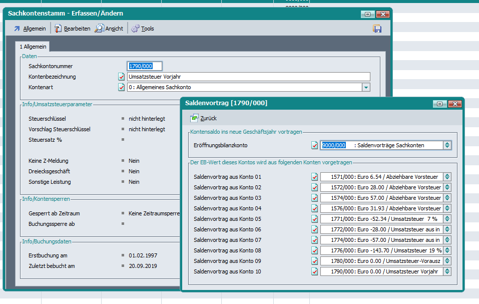 Ausnahme, das Konto ist gleich der Sachkontonummer, sofern ein Vortrag dieses Kontos erwünscht ist (Am Beispielscreen Konto=1790/000 und Konto 10 = 1790/000)