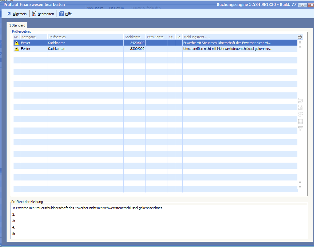 In allen anderen Fällen, wird im Prüflauf Finanzbuchhaltung eine Fehlermeldung ausgegeben-> Konto mit Mehrwertsteuer gebucht, jedoch falsche Kontoart.