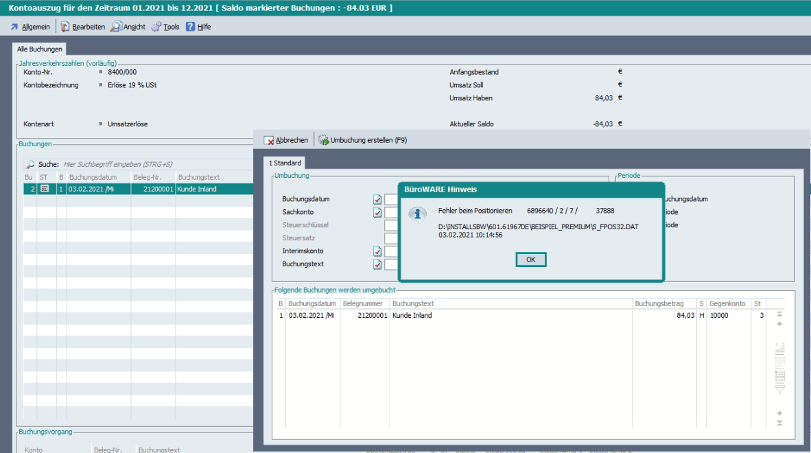 Beim Aufruf der Funktion „Markierte Buchungen umbuchen“ unter Tools im Kontoauszug ist es zu einem Fehler beim Positionieren gekommen.