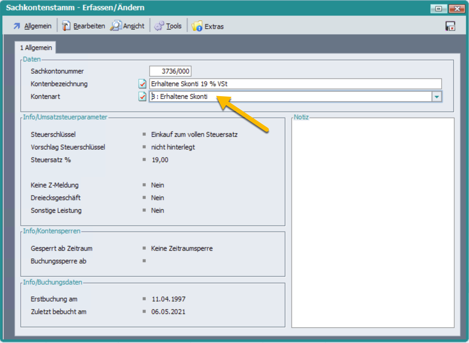 Um korrekt alle Berechnungen im Zusammenhang mit Skonto durchführen zu können, musste die Finanzbuchhaltung erkennen können, dass es sich bei einem Sachkonto um ein Skontokonto handelt. Das erfolgte im Regelfall durch die Kontenart (3 oder 8).