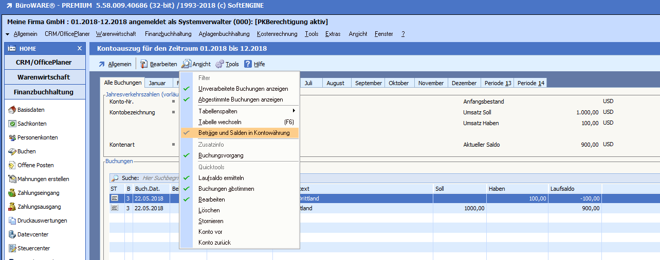 Seit Rev. 40686 ist es möglich bei Sach- und Personenkonten, welche in Fremdwährung geführt werden auch im Kontoauszug die Beträge und Salden in Fremdwährung darzustellen. Dazu können sie unter „Ansicht“ die Option Beträge und Salden in Kontowährung aktivieren. Bei Konten die in EURO geführt werden, wird dieser Menüeintrag ausgeblendet.