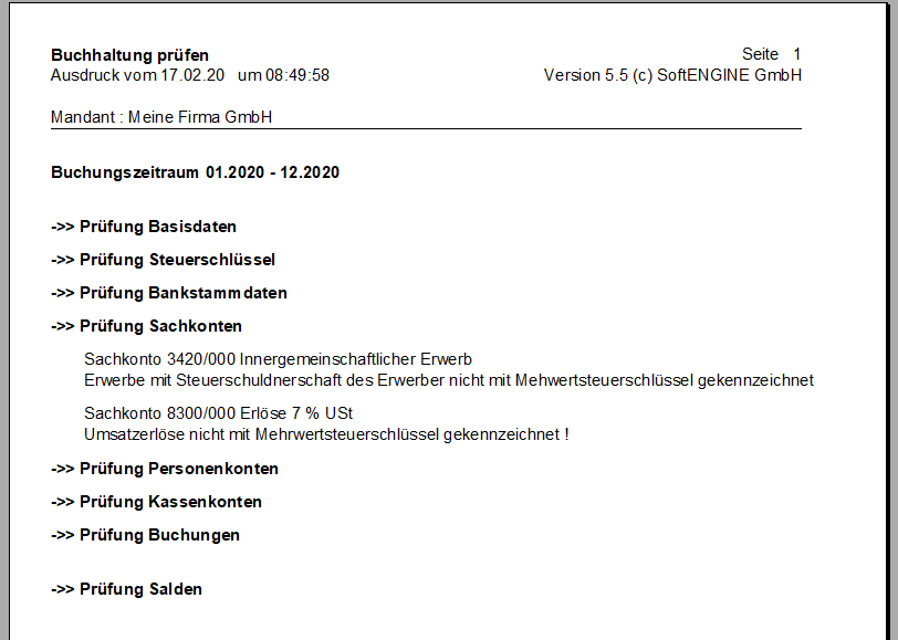 Beim Prüflauf Finanzbuchhaltung wird dann zusätzlich Folgendes geprüft und bei Bedarf als Fehler ausgegeben: