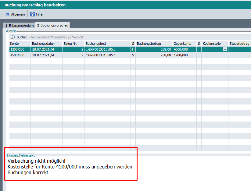 Ab Revision 67845/Beta und 67846/Patch wurde die Prüfung, ob ein Buchungsvorschlag Sachkonten buchungsfähig ist, um eine zusätzliche Prüfung auf Kostenstellen-, Kostenträger- und Projektpflicht erweitert. Hat das zu bebuchende Sachkonto eine aktive Kostenstellen-, Kostenträger- oder Projektpflicht und das jeweilige Feld ist in der Buchung nicht befüllt, dann erfolgt keine Verbuchung. In der Buchungsvorschau ist eine entsprechende Hinweismeldung zu sehen.