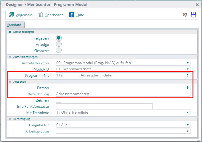 …auf, wenn dieser Dialog mit neuen internen Werkzeugen erstellt wurde UND der Bediener die Bedienerart Designer ist (es wird auch das Designer-Passwort benötigt). …