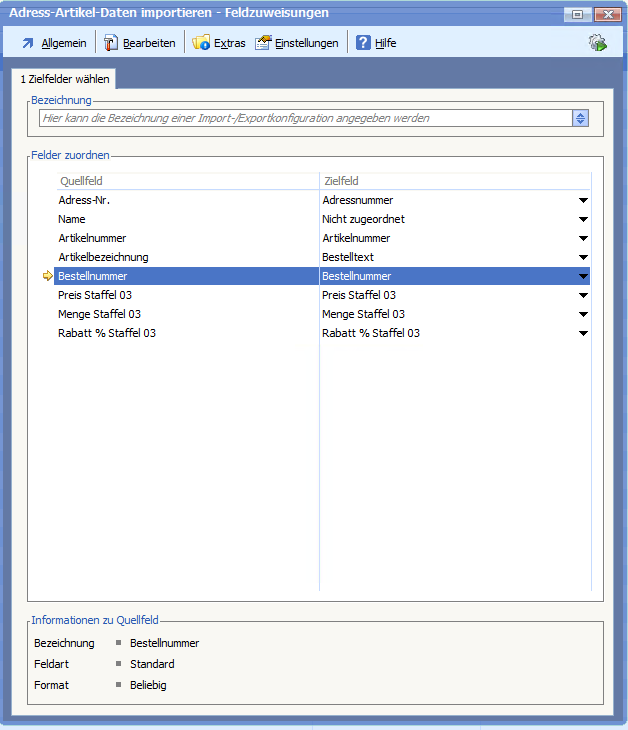 Sofern man im Feld „Bezeichnung“ eine Bezeichnung angibt und Felder zuordnet (Quellfeld > Zielfeld), werden diese Zuordnungen als Schablone gespeichert und diese kann bei zukünftigen Importen einfach ausgewählt werden, sodass nicht jedes Mal die Feldzuweisung erneut gemacht werden muss. …
