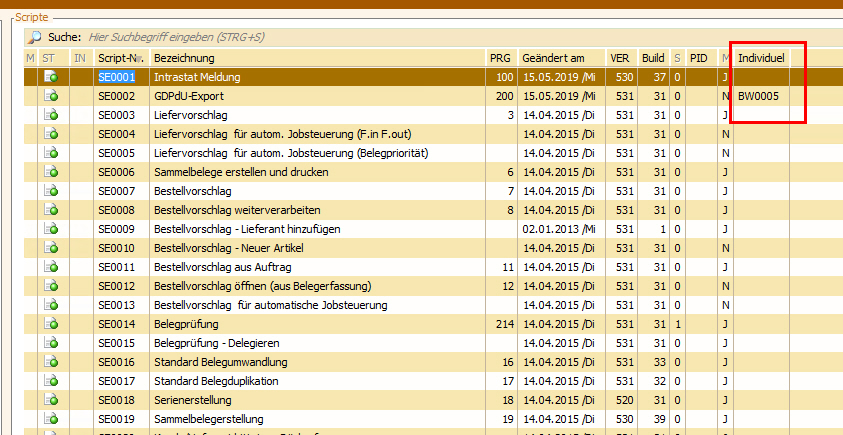 Damit ersichtlich ist , welche SoftENGINE Scripte umgeleitet sind auf Individuelle Scripte, kann das Feld „Individuelle Script-ID (Aufruf) TSCRSE0395_2315_6“ in die Auswahltabelle eingebunden werden.