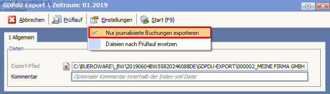 Bei aktiviertem Flag „Nur journalisierte Buchungen exportieren“ wird der Export nur durchgeführt, sofern die Journalisierung für alle Buchungen durchgeführt wurde.