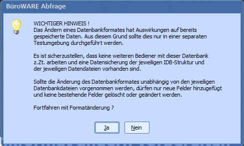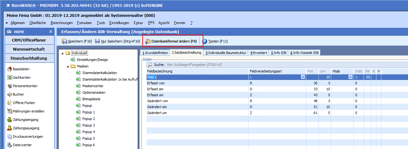 Um eine bestehende Satzbeschreibung einer IDB zu ändern gibt es in der jeweiligen IDB die Funktion „Datenbankformat ändern“: