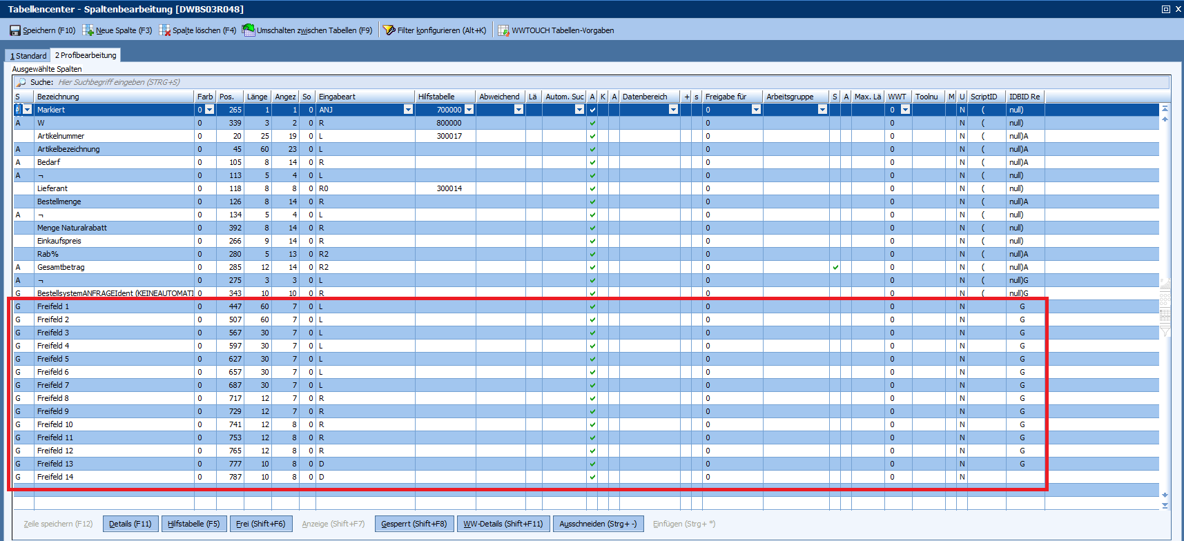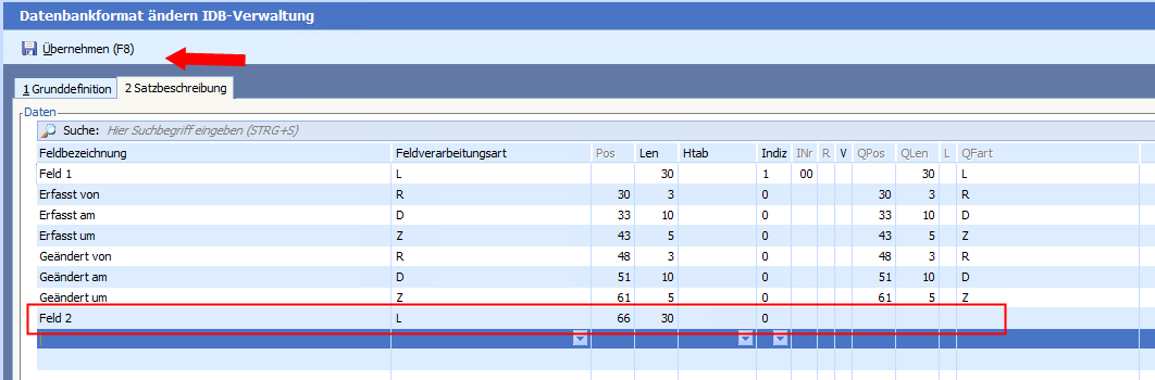 Nun können wir zum Beispiel ein weiteres Feld ( Hier Feld 2) hinzufügen. Die Postion wird automatisch ermittelt, wenn die Zeile mit F12 gespeichert wird.