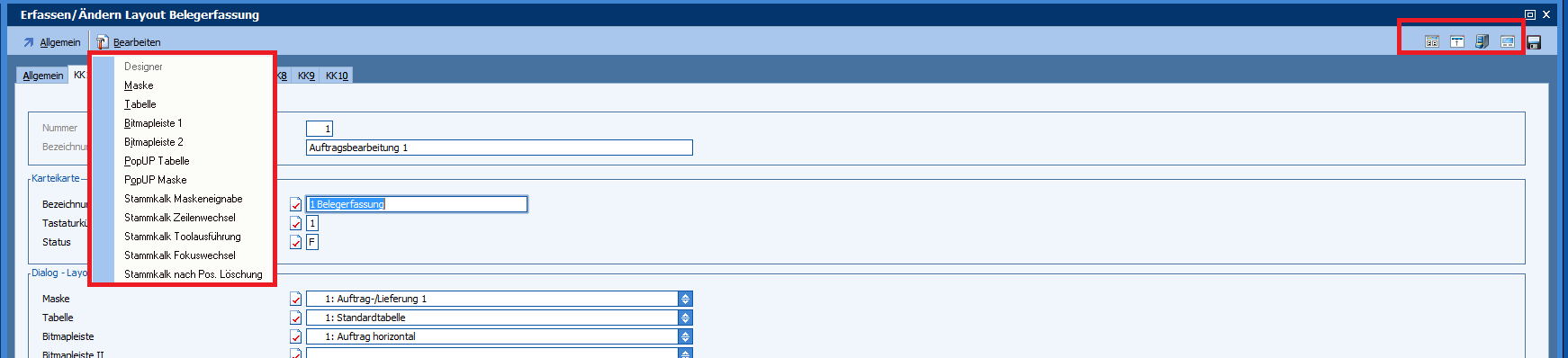 Designelemente wie Kartei/Maske/Tabelle etc. aber auch Programmierung wie Stammdaten-Kalk/Eventscripts stehen hier direkt für Designer zur Auswahl (abhängig von Fenster zu Fenster, welche im Detail zur Verfügung stehen).