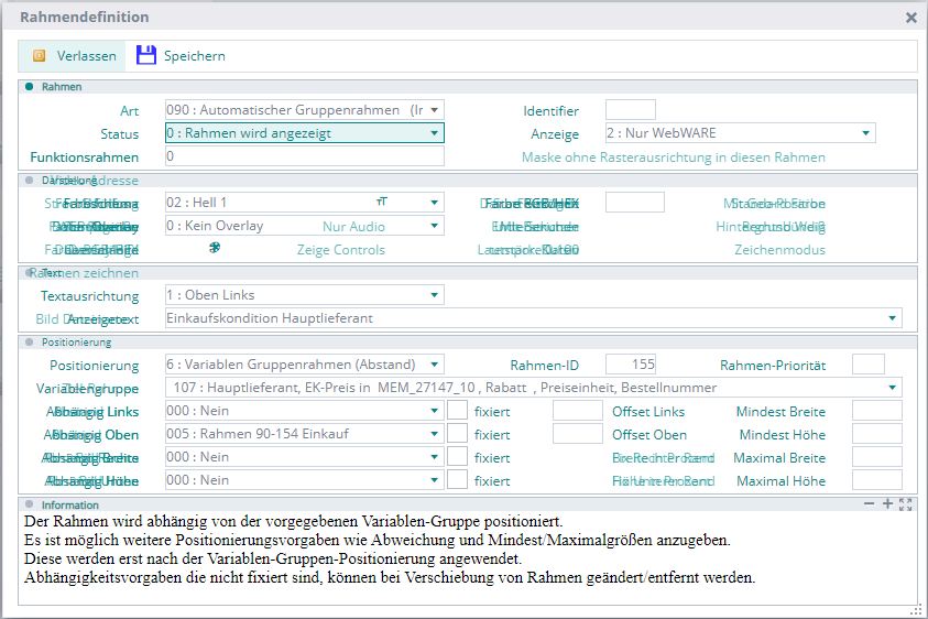 Mit den Revisionen 53048-Beta und 53049-Patch der WEBWARE und dem WW-Framework 2480, enthalten in den Setups seit dem 01.04.2020, können nun Rahmen innerhalb des BüroWARE-Dialog-Rahmens (Rahmenart 92) mit Minus Koordinaten für die Positionierung verwendet werden. Dabei wird, wie in der BüroWARE, ausgehend vom Rand des Rahmen 92 die Position von unten und Rechts berechnet. …