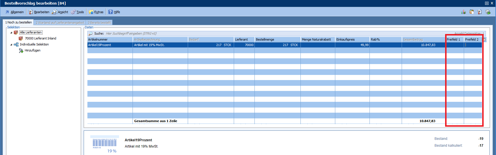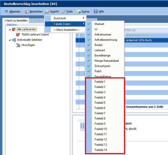 Mit dieser Programmänderung lässt sich der Bestellvorschlag individualisieren. Hierzu gibt es in der IDB SE0272 14 neue Freifelder. Diese Felder können beim Bearbeiten des Bestellvorschlags über „Ansicht“ in der der Tabelle eingeblendet werden.