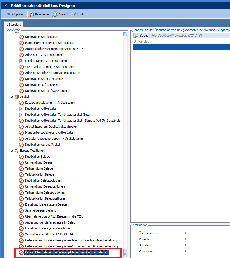 Mit dieser Programmänderung gibt es eine neue Feldübernahmedefinition für die Kasse. Mit dieser Feldübernahmedefinition können die Belegkopfdaten bei einem Belegartwechsel übernommen werden.