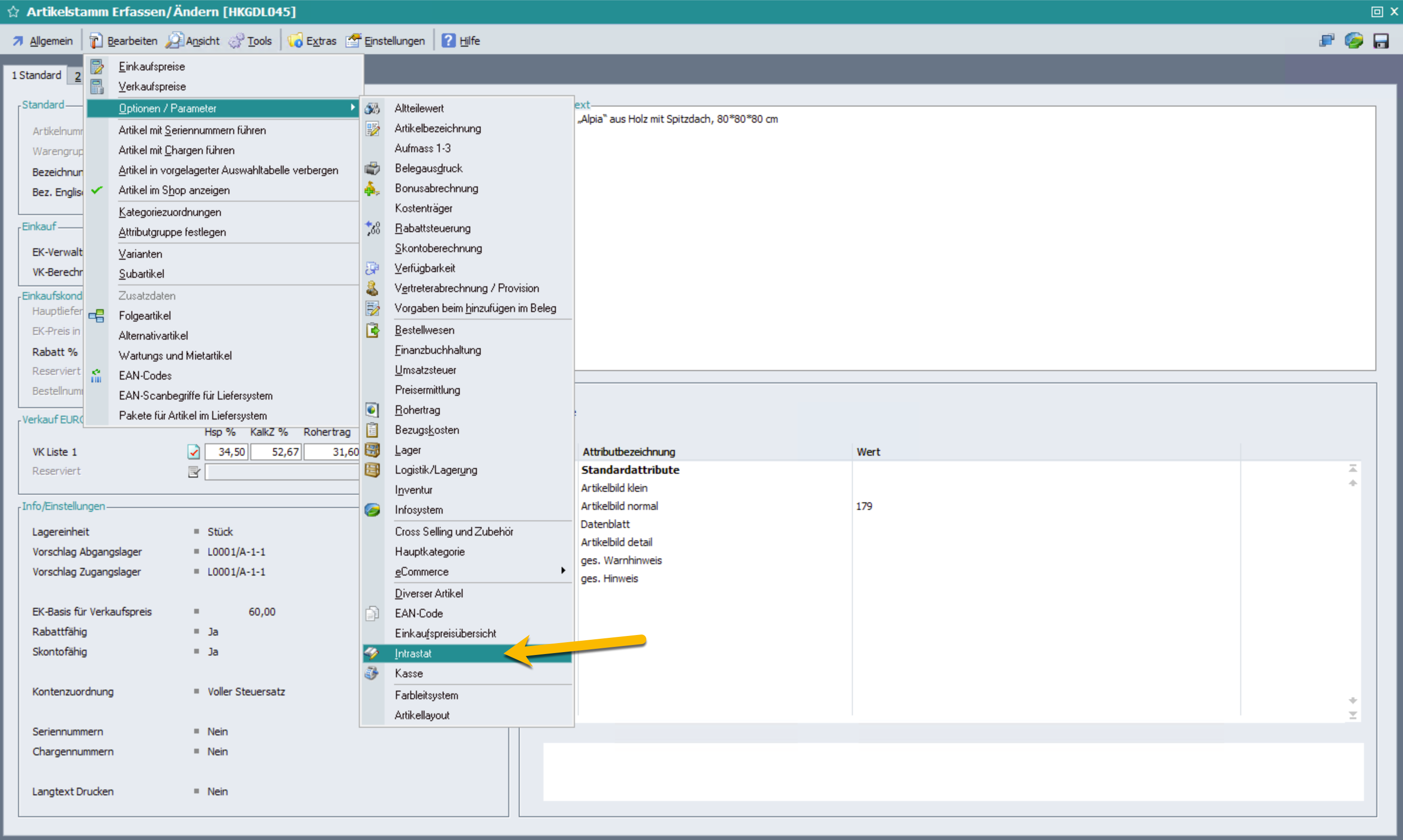 Damit ein Artikel bei der Erstellung von Intrastatmeldungen berücksichtigt wird, müssen im Bearbeitungsdialog über den Menüeintrag „Bearbeiten > Optionen/Parameter > Intrastat“ Angaben zur Zolltarifnummer hinterlegt werden.