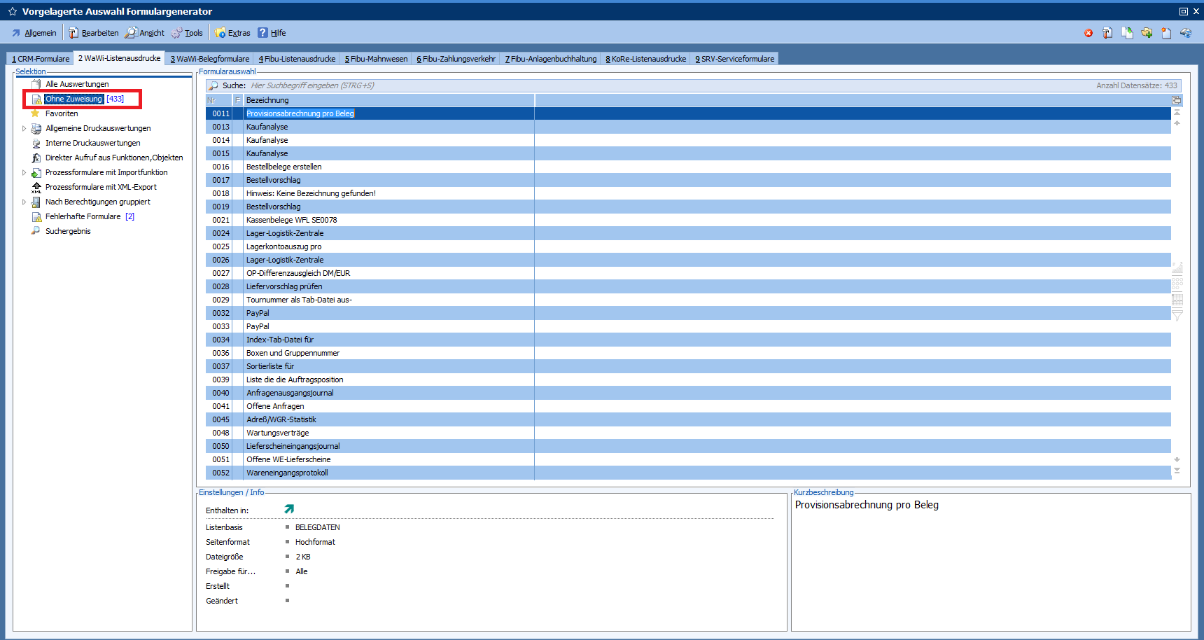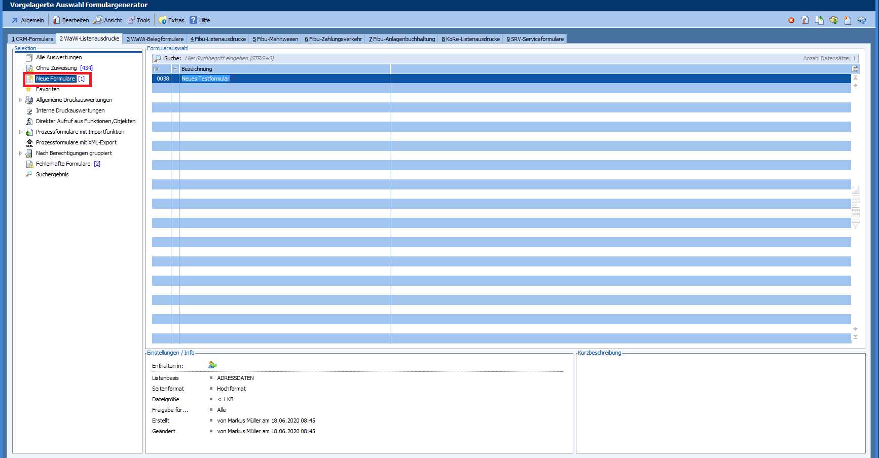 Um eine neue Auswertung hinzuzufügen, müssen Sie in der linken oberen Tabelle die gewünschte Druckmappe markiert haben und danach unten links in die Tabelle Formulare klicken. Dadurch kann mit F3 oder dem Quicktool „Neu“ ein neues Ausgabeformular hinzugefügt werden. …