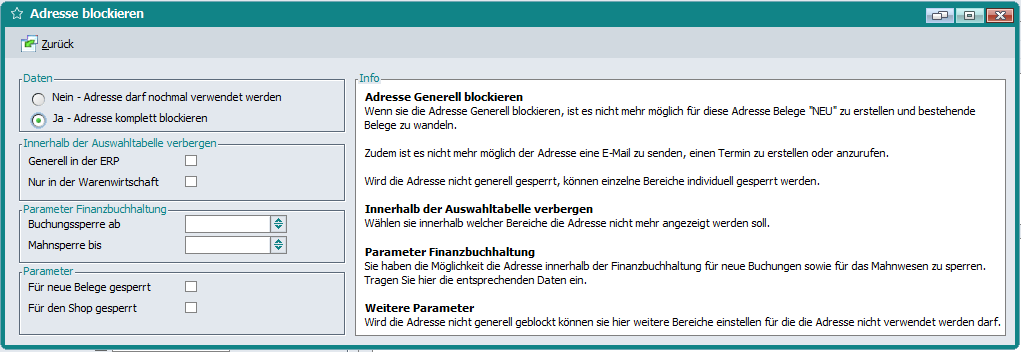 Wurde innerhalb des Adressstamms eine Adresse blockiert, wird diese ab Rev. 63914 / S-i-E und Rev. 63916 / Patch trotzdem bei sämtlichen Auswertungen im Bereich Finanzbuchhaltung berücksichtigt. Wie z.B. Offene Posten, Summen Saldenliste, Mahnwesen, Zahlungsverkehr. Für den Fall, dass das nicht erwünscht ist, steht folgendes Zugriffsrecht zur Verfügung: [DRUCK_ALLG, Nr: 032 – Allgemeine Druckeinstellungen (V4.3), Gesperrte Adressen in Fibu-Auswertungen ignorieren]