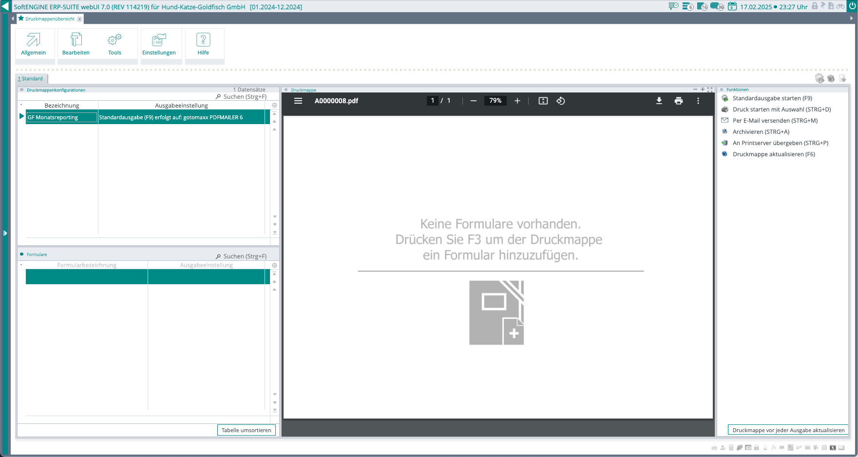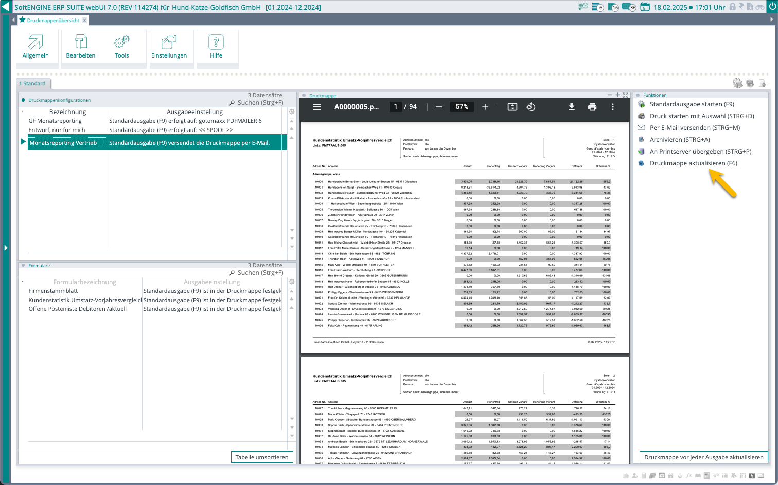 Diese Aktualisierung kann normalerweise so eingestellt werden, dass sie beim Öffnen der Druckmappe automatisch erfolgt, andererseits lässt sich dieser Vorgang auch manuell starten. Dazu drücken Sie die Taste F6, beziehungsweise nutzen sie die Funktion „Aktualisieren“ rechts in der Funktionsübersicht.
