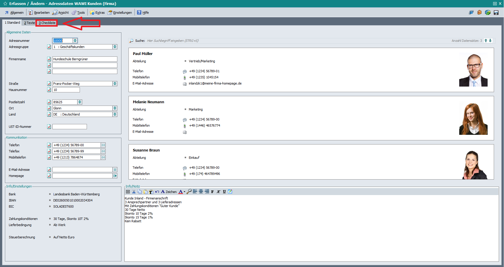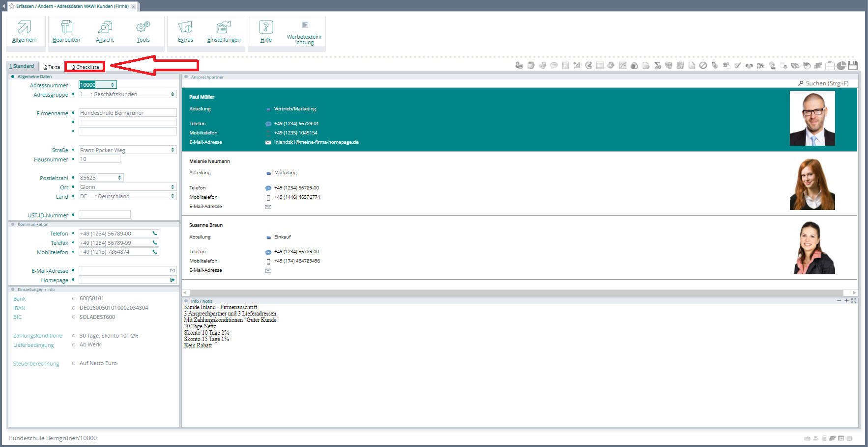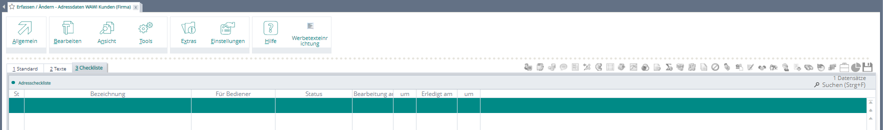 Mit der Checkliste im Adressstamm können Sie mehrere kleinere Aufgaben und Tätigkeiten in ihren Stammdaten für die einzelnen Adressen hinterlegen. Zu finden ist diese auf Karteikarte 3 in der jeweiligen Adresse.