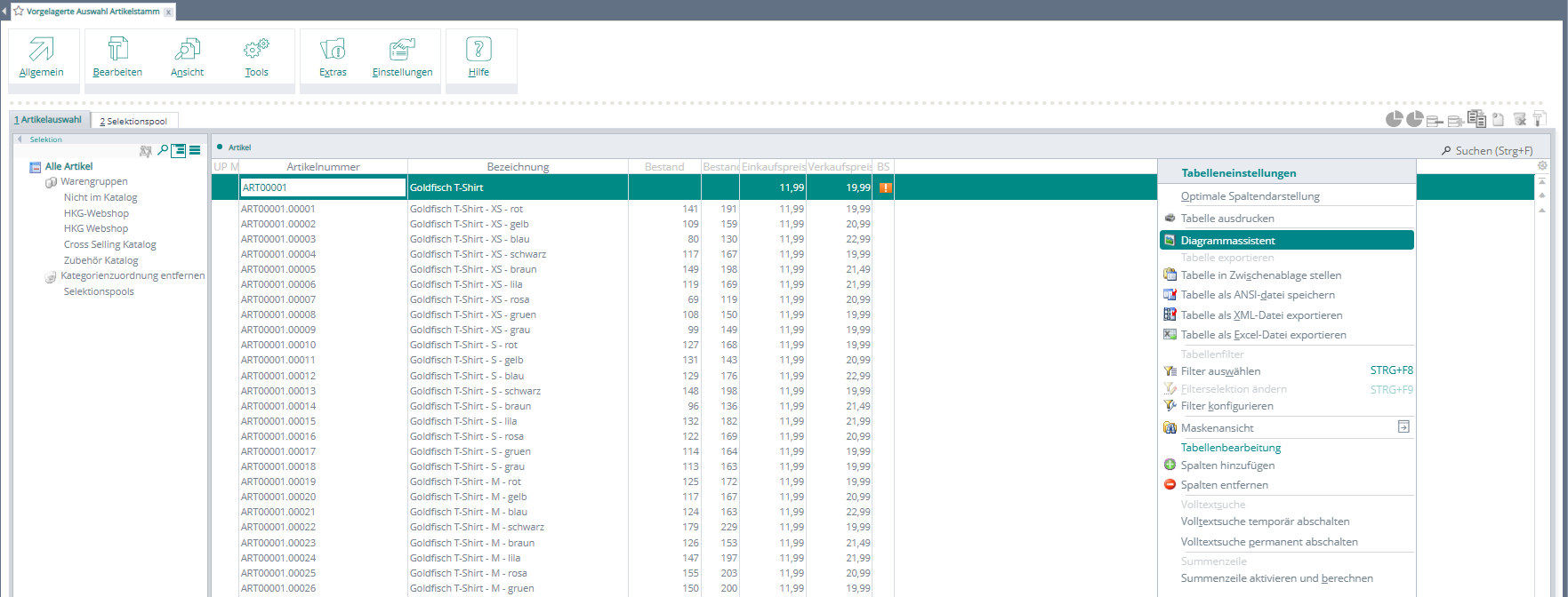 Den Diagrammassistenten können Sie überall aufrufen, wo Sie eine Tabelle mit auswertbaren Informationen vorfinden wie z.B. bei den Artikeln.