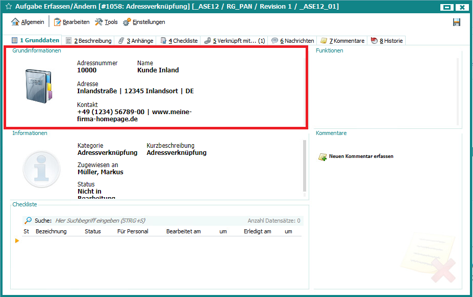 Mit [F3] können Sie nun neue Checklisteneinträge bei dieser Adresse hinterlegen, die Sie im Sinne einer To-Do-Liste abarbeiten können und einen passen Status hinterlegen.