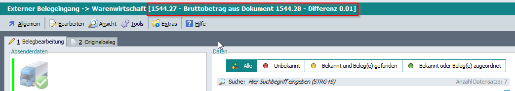 Bei einer Dokumentenverarbeitung wird im Hintergrund ein interner Beleg erzeugt. Es kann nun vorkommen, dass eine Rundungsdifferenz  zwischen dem internen Beleg und dem erzeugten Dokument entsteht. Im Fenstertitel ist dies auch zu erkennen.