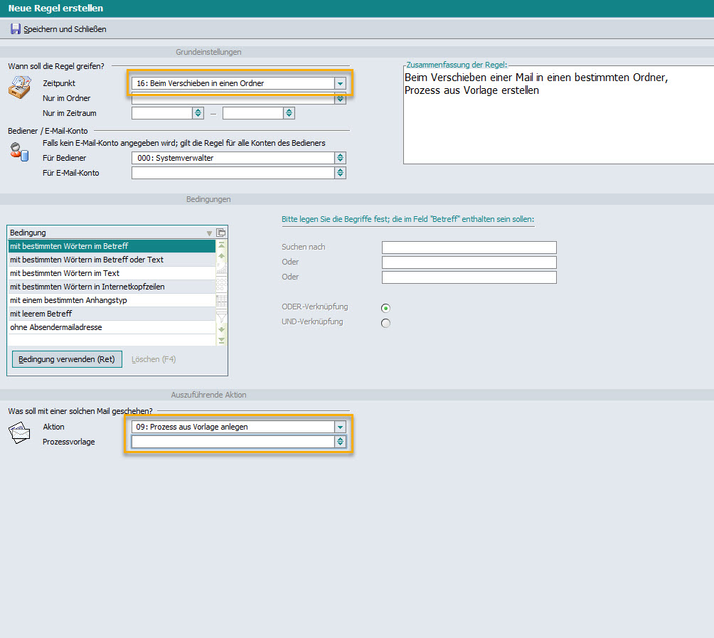 Im Regelassistent des Mailsystems eine neue Regel angelegt. In dieser ist hinterlegt: „Beim Verschieben in den Ordner xxx, neuen Prozess aus Vorlage x erstellen“