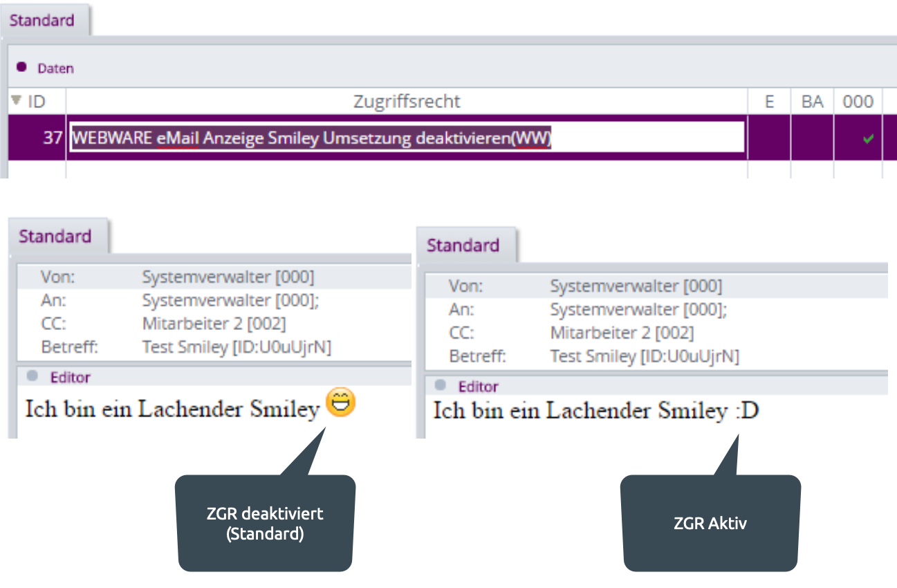 In der Anzeige der Emails werden bekannte „Smiley-Zeichenkombinationen“ durch das entsprechende Smiley ersetzt. Ist das nicht gewünscht, lässt sich diese automatische Ersetzung per Zugriffsrecht abschalten.