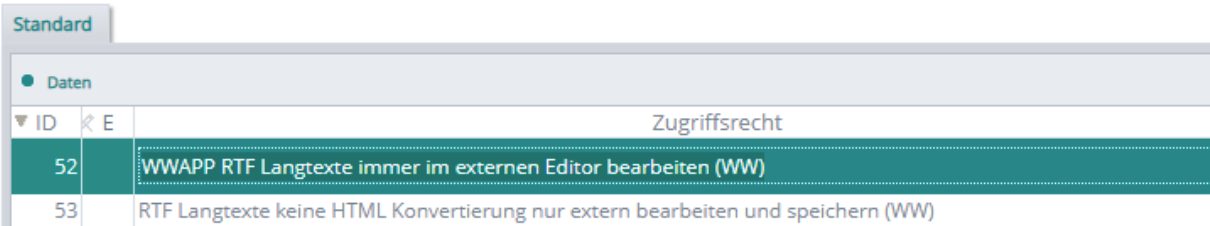 Diese Zugriffsrechte regeln die Bearbeitung von RTF-Langtexten (z.B. Artikeltexte).